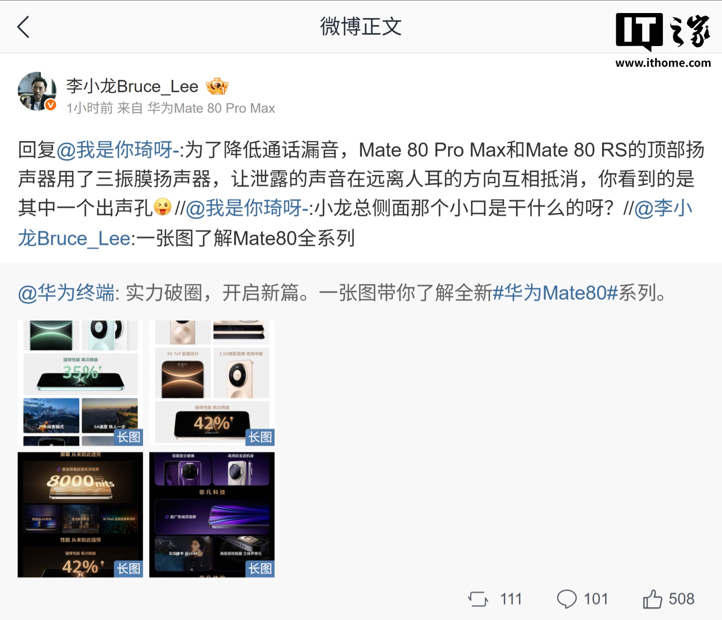 IT之家 11 月 25 日消息正规实盘股票配资平台,华为终端 BG CTO 李小龙今天在微博透露,华为 Mate 80 Pro Max 和 Mate 80 RS 手机侧面顶部的细开口科技降低通话漏音。