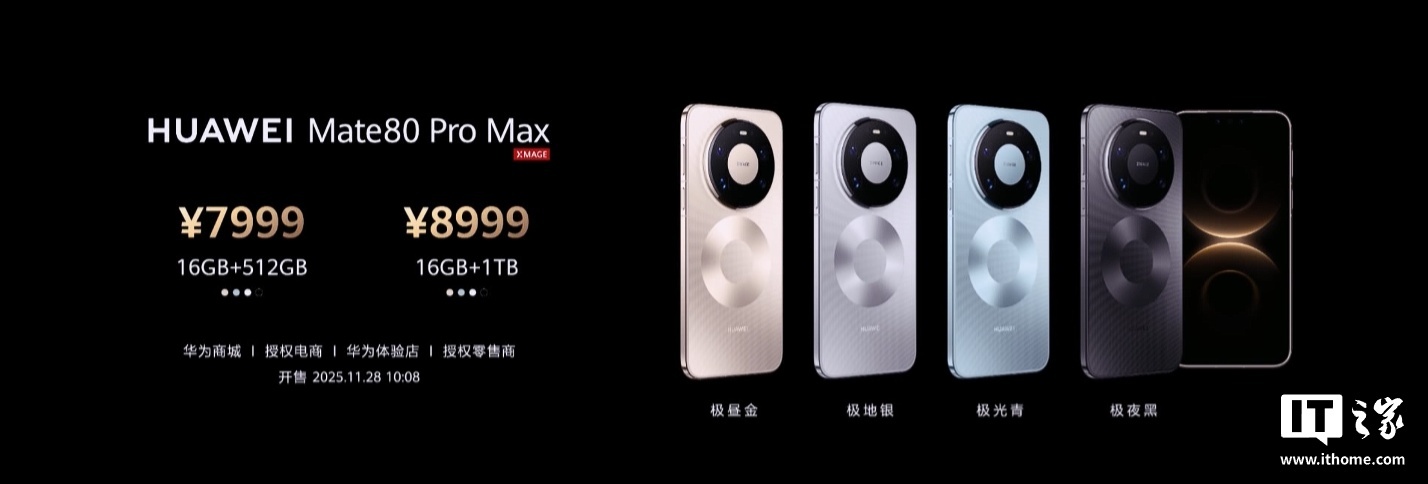 而 Mate 80 Pro Max 手机则标价 7999 元起,采用全金属玄武架构,配备第二代昆仑玻璃、超坚韧玄武机身、超耐刮金属材质,全系支持 IP69 级抗高温高压喷水、6 米 IP68 级防尘抗水,标配 3D TOF 超精密前置摄像头。